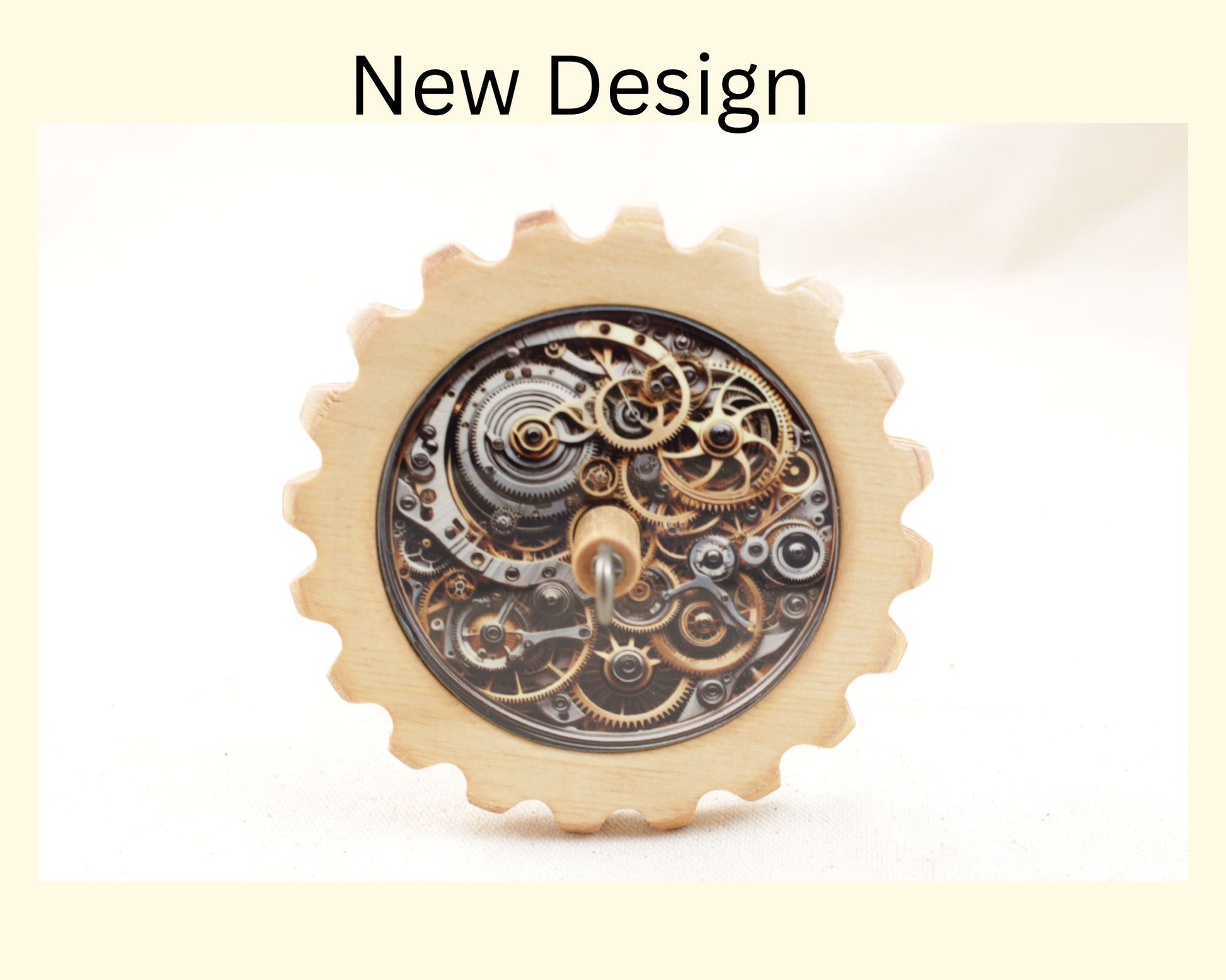 It features a hand-turned 3 1/2" diameter whorl made from Baltic birch ply inlaid with sublimated images, with a 10" long birch shaft and a cup hook with a bronze finish. The wood has a golden pecan stain and glaze finish.