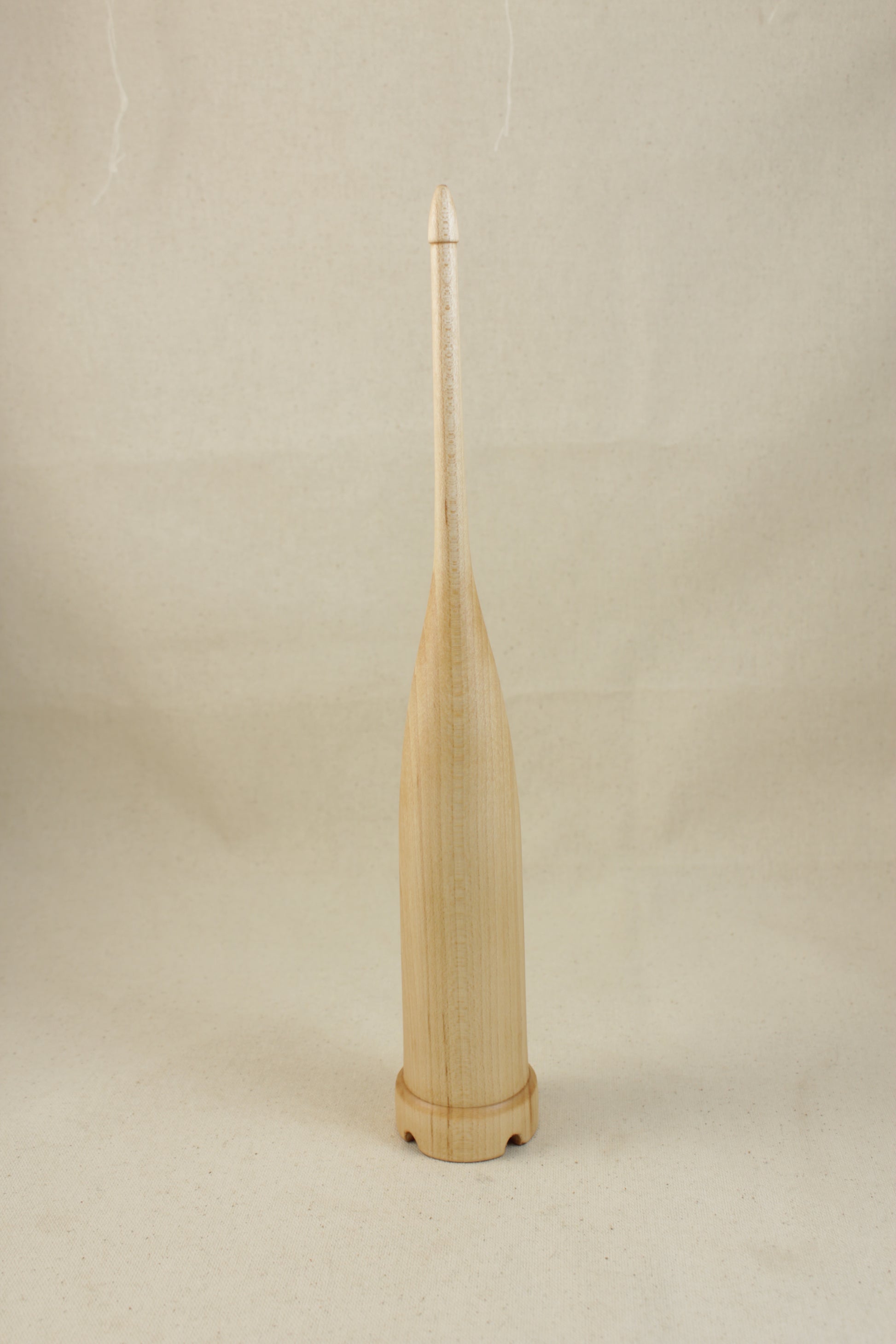 This spindle is wound like a nostepinne and the yarn is secured by running the spun single through the notches on the bottom before securing with a half hitch on the top.